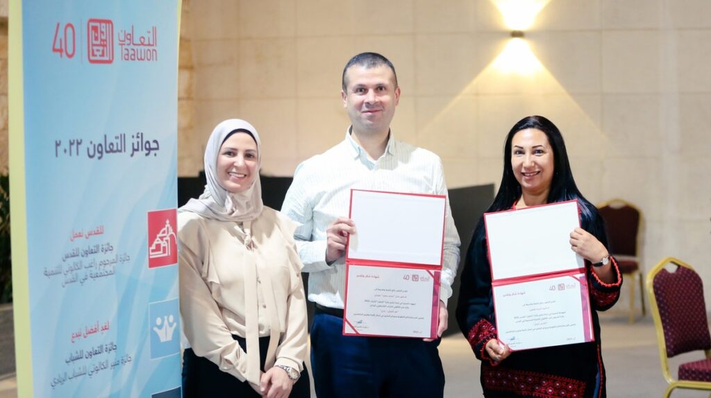 وجرى تكريم أعضاء لجان التحكيم لكل من هذه الجوائز، والذين أسهموا في مراجعة الطلبات والزيارات الميدانية للمؤسسات، وتم تكريم د. شاهين لمشاركتها في مراجعة وتقيم الطلبات الخاصة بجائزة التعاون للقدس، ود. جعيدي لمشاركته في مراجعة وتقييم الطلبات الخاصة بجائزة التعاون للشباب.