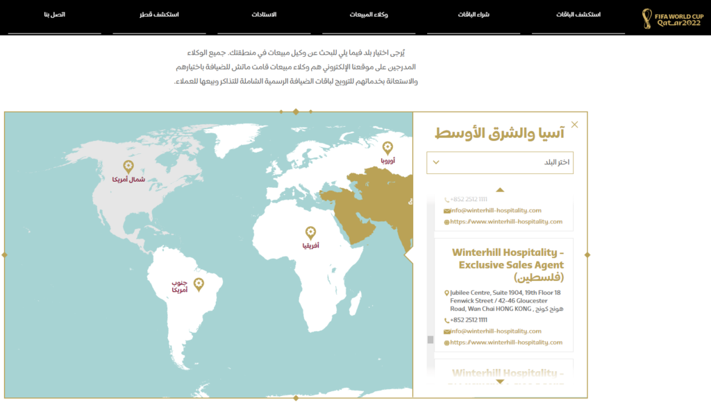 ويتضمن الموقع عناوين لوكلاء المبيعات في عدد من دول المنطقة، الذين تعاقد معهم الاتحاد الدولي لكرة القدم “الفيفا” لتسويق وبيع حزم الضيافة وتذاكر المباريات.
