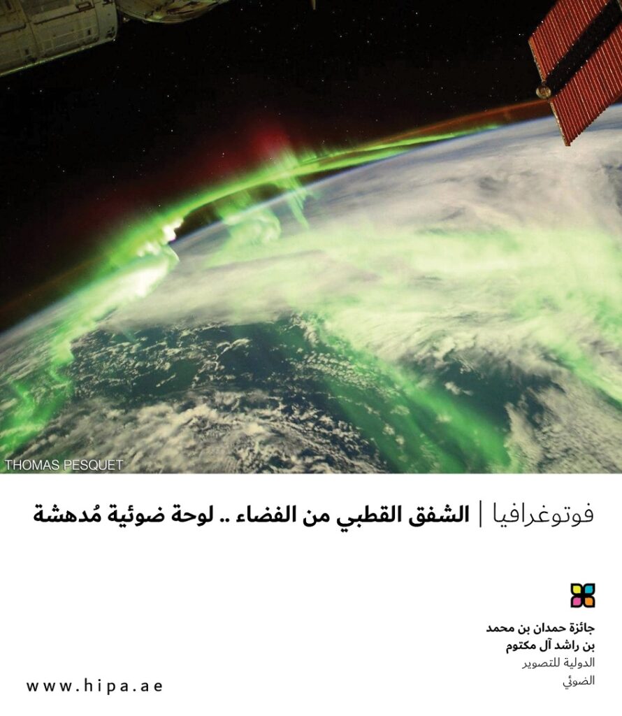 من محطة الفضاء الدولية، وعلى ارتفاع 250 ميلاً فوق الأرض، التقط رائد الفضاء الفرنسي “توماس بيسكيه”، صورةً اعتُبِرَت من أروع صور الشفق القطبيّ على الإطلاق. حينها كانت ظاهرة الشفق القطبيّ في أوجّها بسبب اجتياح العواصف الشمسية الأرض، والتي ينتج عنها شرائط خضراء تتحرّك حول الكوكب، ثم تتلاشى في موجاتٍ من الضوء الأحمر. و قد أرفق “بيسكيه” تعليقاً على الصورة التي نشرها، قال فيه: شفقٌ قطبيّ آخر لكنه مميز كونه ساطع للغاية، إنه البدر الذي يضيء جانب الظل من الأرض، مثل ضوء النهار تقريباً. ولم يُحدّد “بيسكيه” مكان الشفق القطبي على الكوكب، أو ما إذا كان الشفق القطبي الشمالي أو الشفق الجنوبي الأسترالي.
