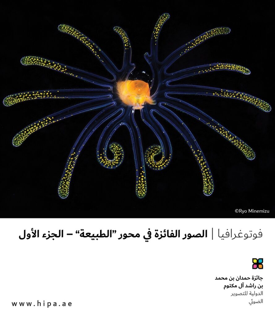 المركز الأول في “الطبيعة” اختار المصور الياباني “ريو ميناميزا” بعملٍ فوتوغرافيّ بديع بعنوان “جميرا” نرى فيه كائناً من فصيلةٌ من يرقات Mollusca Gastropoda تصادفها ليلاً قرب جزيرة كومي – أوكيناوا في اليابان، وهي صغيرةٌ جداً فالثخانة الأعلى للمحارة في وسطها تبلغ 3 مم فقط، وقطرها الإجمالي حوالي 20 مم. يوجد حولها أغشية للسباحة يُطلق على واحدها “فيلوم”، وهي مبطّنةٌ بالأهداب. إنها مخلوقٌ حذر، وحتى لو شَعَرَت بدفق ماءٍ طفيف فإنها تختبئ في محارتها. عنوان الصورة جاء من التشابه مع نخلة جميرا، إحدى المناظر الطبيعية الخلاّبة في دولة الإمارات العربية المتحدة.