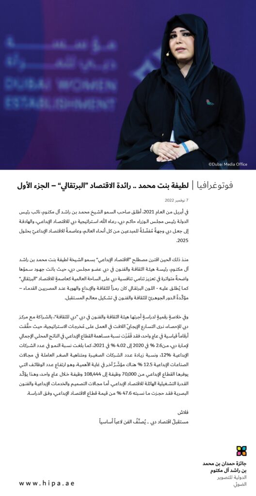 منذ ذلك الحين اقترن مصطلح “الاقتصاد الإبداعي” بسمو الشيخة لطيفة بنت محمد بن راشد آل مكتوم، رئيسة هيئة الثقافة والفنون في دبي عضو مجلس دبي، حيث باتت جهود سموّها واضحةً متواترة في تعزيز تنامي تنافسية دبي على الساحة العالمية كعاصمةٍ للاقتصاد “البرتقالي” كما يُطلق عليه – اللون البرتقالي كان رمزاً للثقافة والإبداع والهوية عند المصريين القدماء – مؤكِّدةً الدور الجوهريّ للثقافة والفنون في تشكيل معالم المستقبل.
