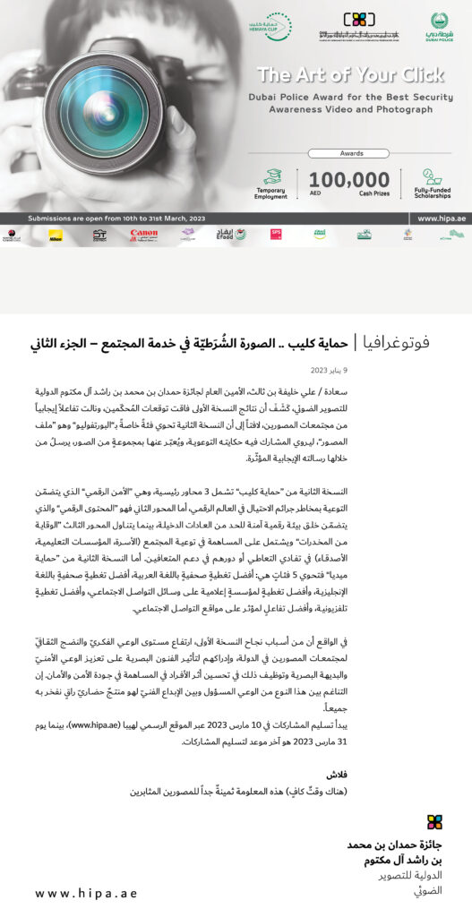 سعادة / علي خليفة بن ثالث، الأمين العام لجائزة حمدان بن محمد بن راشد آل مكتوم الدولية للتصوير الضوئي، كَشَفَ أن نتائج النسخة الأولى فاقت توقعات المُحكّمين، ونالت تفاعلاً إيجابياً من مجتمعات المصورين، لافتاً إلى أن النسخة الثانية تحوي فئةً خاصةً بـ”البورتفوليو” وهو “ملف المصور”، ليروي المشارك فيه حكايته التوعوية، ويُعبّر عنها بمجموعةٍ من الصور، يرسلُ من خلالها رسالته الإيجابية المؤثّرة.