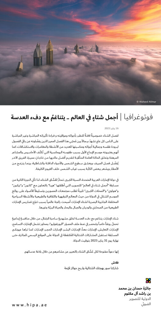في دولة الإمارات العربية المتحدة، النسبة الكبرى تنحازُ لعُشّاق الشتاء، لذا تأتي الدورة الثانية من مسابقة “أجمل شتاء في العالم” للتصوير، التي أطلقتها “هيبا” بالتعاون مع “كانون” و”نيكون” و”هواوي” و”المحلات الكبرى” تلبيةً لطلب مجتمعات المصورين وتسليطاً للأضواء على روائع الموسم الشتائي في الدولة من حيث المعالم الترفيهية والثقافية والطبيعية والأنشطة السياحية المختلفة. الجاذبية البصرية لشتاء الإمارات أصبحت رائجة عالمياً بسبب تنوّع تضاريس الإمارات الطبيعية من الصحاري والوديان والجبال والبحار والحياة البريّة وغيرها.