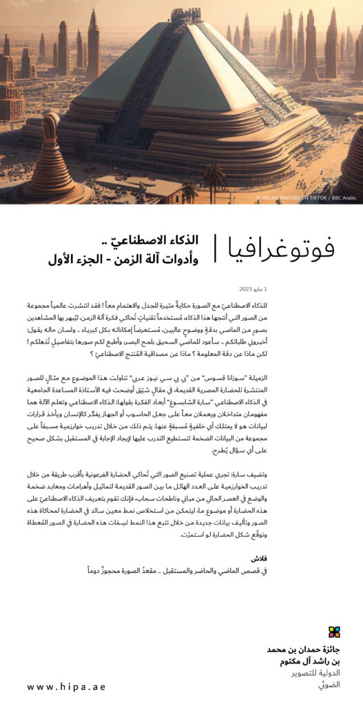 الزميلة “سوزانا قسوس” من “بي بي سي نيوز عربي” تناولت هذا الموضوع مع مثالٍ للصور المنتشرة للحضارة المصرية القديمة، في مقالٍ شيّق أوضحت فيه الأستاذة المساعدة الجامعية في الذكاء الاصطناعي “سارة الشابسوغ” أبعاد الفكرة بقولها: الذكاء الاصطناعي وتعلم الآلة هما مفهومان متداخلان ويعملان معاً على جعل الحاسوب أو الجهاز يفكّر كالإنسان ويأخذ قرارات لبيانات هو لا يمتلك أي خلفيةٍ مُسبقةٍ عنها. يتم ذلك من خلال تدريب خوارزمية مسبقاً على مجموعة من البيانات الضخمة لتستطيع التدرب عليها لإيجاد الإجابة في المستقبل بشكل صحيح على أي سؤال يُطرح.