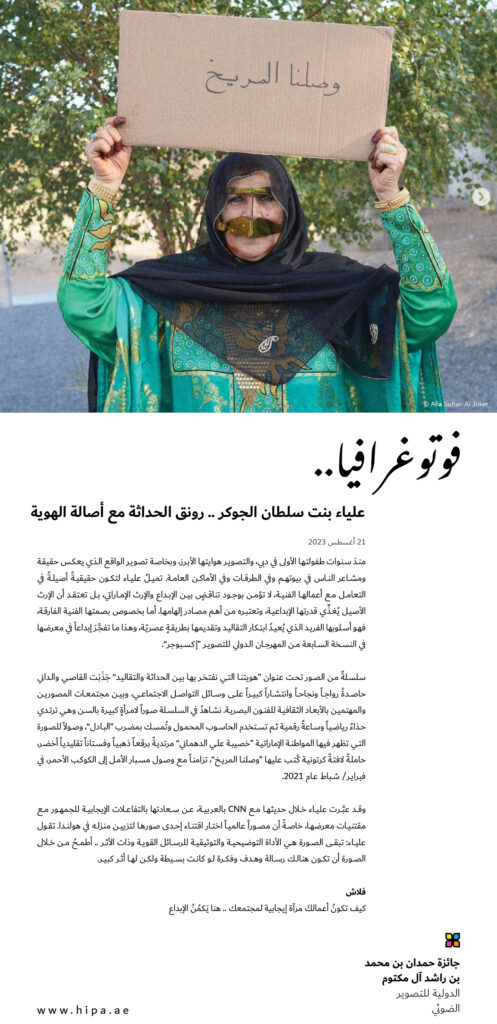 سلسلةٌ من الصور تحت عنوان “هويتنا التي نفتخر بها بين الحداثة والتقاليد” جَذَبَت القاصي والداني حاصدةً رواجاً ونجاحاً وانتشاراً كبيراً على وسائل التواصل الاجتماعي، وبين مجتمعات المصورين والمهتمين بالأبعاد الثقافية للفنون البصرية. نشاهدُ في السلسلة صوراً لامرأةٍ كبيرة بالسن وهي ترتدي حذاءً رياضياً وساعةً رقمية ثم تستخدم الحاسوب المحمول وتُمسك بمضرب “البادل”، وصولاً للصورة التي تظهر فيها المواطنة الإماراتية “خصيبة علي الدهماني” مرتديةً برقعاً ذهبياً وفستاناً تقليدياً أخضر، حاملةً لافتةً كرتونية كُتب عليها “وصلنا المريخ”، تزامناً مع وصول مسبار الأمل إلى الكوكب الأحمر، في فبراير/ شباط عام 2021.