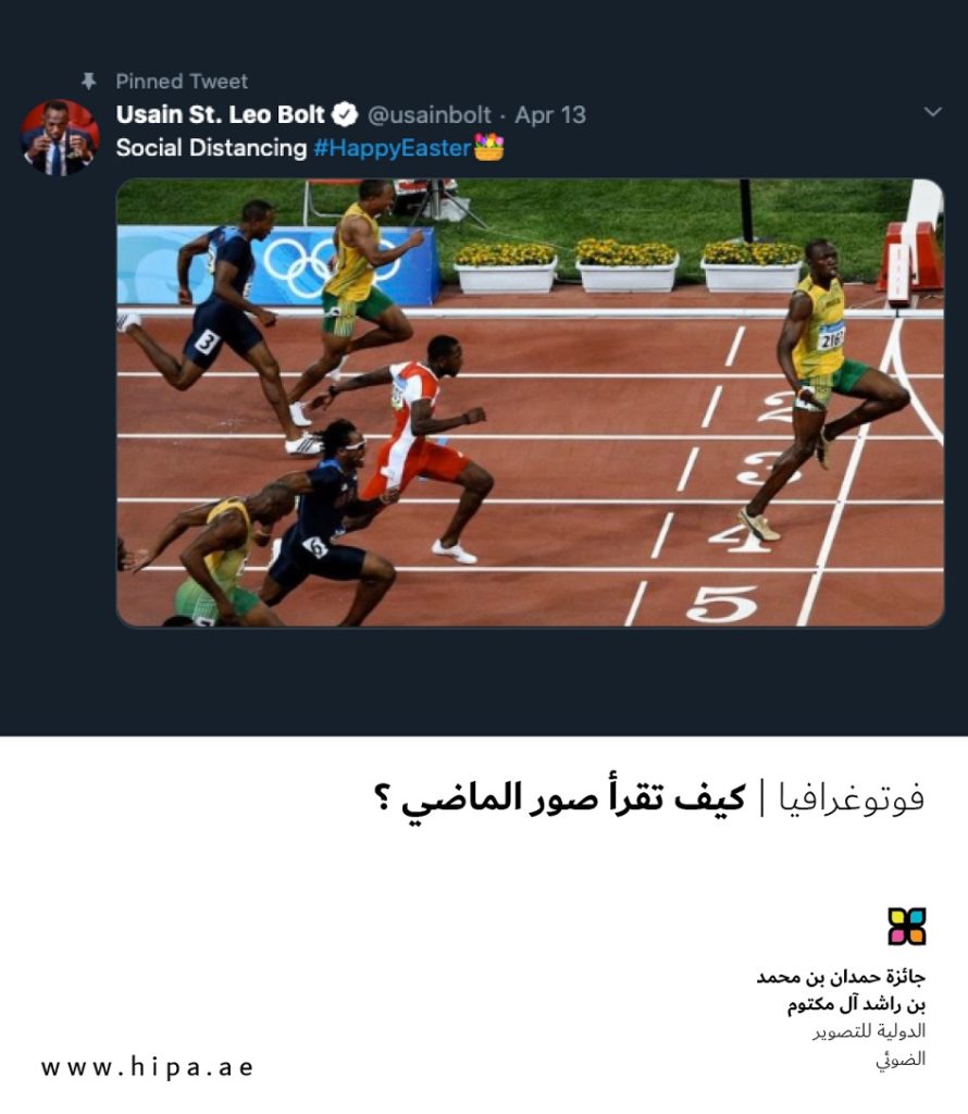 لقد نَشَرَ أسطورة ألعاب القوى الجامايكي “يوسين بولت”، صورة له أثناء الفوز في أحدى سباقات العدو، وقد اجتاحت وسائل التواصل الاجتماعي، بعدما دعا للتباعد الاجتماعي في ظل تفشي فيروس كورونا المستجد، بطريقةٍ طريفة. الصورة التقطها مصور وكالة فرانس برس “نيكولا أسفوري”، مُظهراً “بولت” وهو يجتاز خط الوصول في سباق 100م ضمن ألعاب بكين 2008 الأولمبية، حيث حقَّقَ رقماً خارقاً بَلَغَ 9,69 ثوان، محطماً رقمه القياسي العالمي.