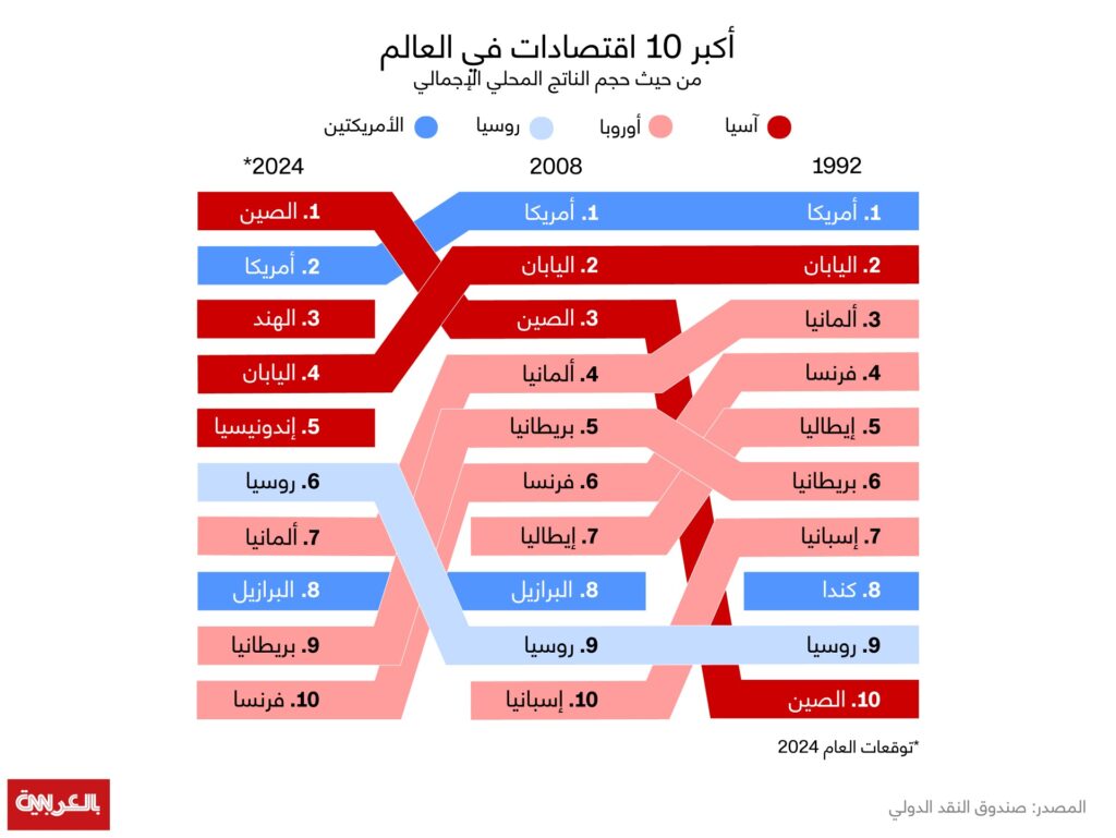 دبي، الإمارات العربية المتحدة (CNN) – تشير توقعات أصدرها البنك الدولي وصندوق النقد الدولي إلى أن الدول الآسيوية قد تحتل المراكز الـ5 الأولى على قائمة أكبر اقتصادات العالم من حيث حجم الناتج المحلي الإجمالي بحلول العام 2024، متخطية بذلك القوى الاقتصادية الأوروبية.