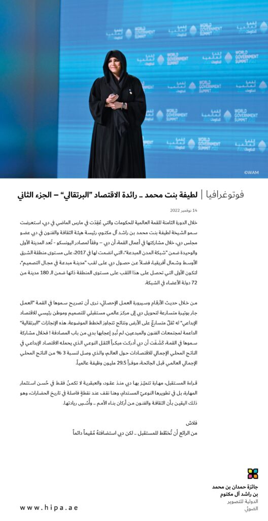 خلال الدورة الثامنة للقمة العالمية للحكومات والتي عُقِدَت في مارس الماضي في دبي، استعرضت سمو الشيخة لطيفة بنت محمد بن راشد آل مكتوم، رئيسة هيئة الثقافة والفنون في دبي عضو مجلس دبي، خلال مشاركتها في أعمال القمة، أن دبي – وفقاً لمصادر اليونسكو – تُعد المدينة الأولى والوحيدة ضمن “شبكة المدن المبدعة”، التي انضمت لها في 2017، على مستوى منطقة الشرق الأوسط وشمال أفريقيا، فضلاً عن حصول دبي على لقب “مدينة مبدعة في مجال التصميم”، لتكون الأولى التي تحصل على هذا اللقب على مستوى المنطقة ذاتها ضمن الـ 180 مدينة من 72 دولة الأعضاء في الشبكة.