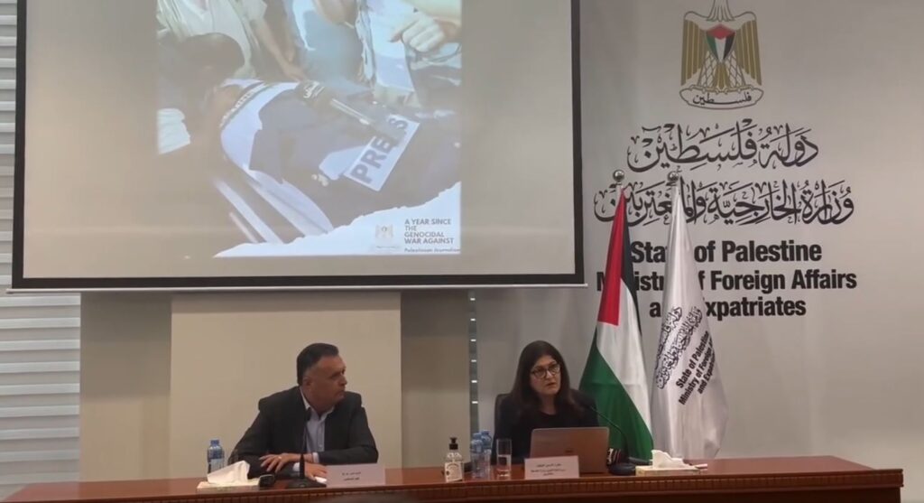 أطلعت وزيرة الدولة لشؤون وزارة الخارجية والمغتربين فارسين شاهين، ووزيرة شؤون المرأة منى الخليلي، ورئيس نقابة الصحفيين ناصر أبو بكر، أعضاء السلك الدبلوماسي المعتمد لدى دولة فلسطين، على حجم الجرائم والانتهاكات التي يرتكبها الاحتلال الإسرائيلي بحق الصحفيين والمؤسسات الإعلامية والعاملين في قطاع الإعلام.