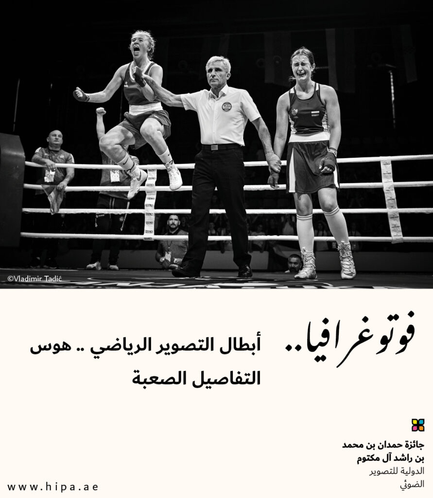 معالي/ محمد أحمد المر، رئيس مجلس إدارة مؤسسة مكتبة محمد بن راشد آل مكتوم، قام بتكريم الفائزين في محور “التصوير الرياضي” حيث حصد المركز الأول المصور “فلاديمير تاديك” من البوسنة والهرسك، بعملٍ بعنوان “النصر والهزيمة” نرى فيه الحكم يُمسك بمعصمَي ملاكمتين شابتين، وإحدى اليدين على وشك أن تُرفَع لتُعلن صاحبتُها فائزة، وما إن ترتفع يدُ المنتصرة، حتى تنفجر فرحتُها في لحظةٍ تاريخية، فيضيء وجهُها ببريق الانتصار، وقد أدركت أن شهوراً من التدريب والإصرار قد أثمرت أخيراً. إلى يسار الحكم، تقف المُلاكِمة المهزومةُ مُثقلةً بالإرهاق والخيبة.