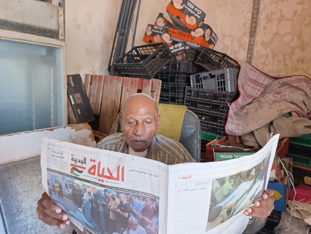 عبد الباسط خلف- يتخذ الحاج غالب الدمج من حانوته الصغير، وسط مجمع الكراجات في جنين، مكانا دائما لبيع الصحف منذ عام 1964.