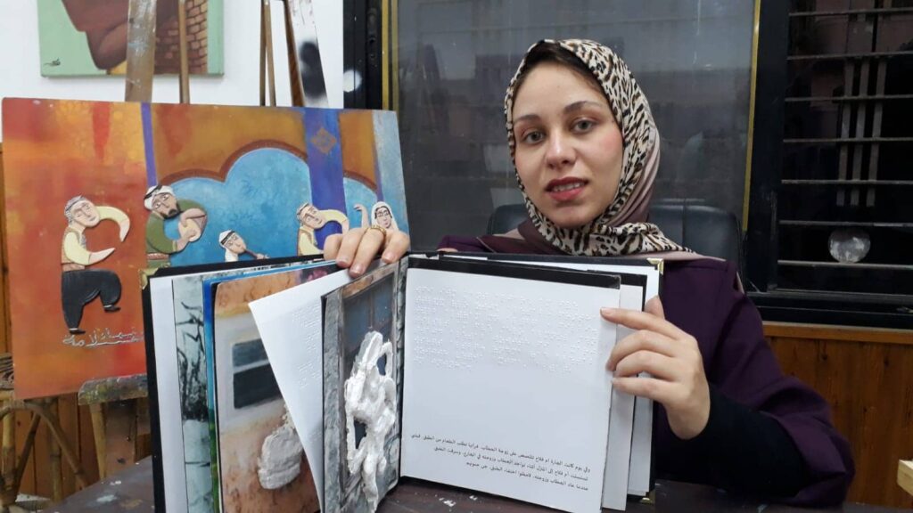لميس الأسطل- شجرة الحطاب تهدي نور البصيرة لعالم خيمه الظلام، تيماء سلامة فنانة تشكيلية تنحت الحكايات الشعبية والرسومات بلغة “برايل” لتدخل ضوءاعلى حياة ذوي الإعاقة البصرية.